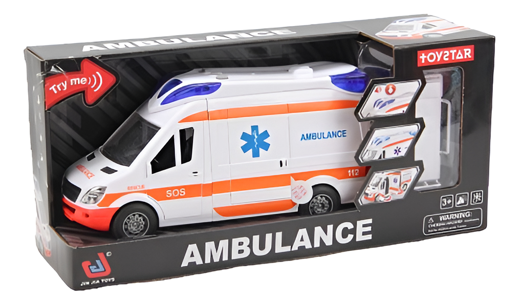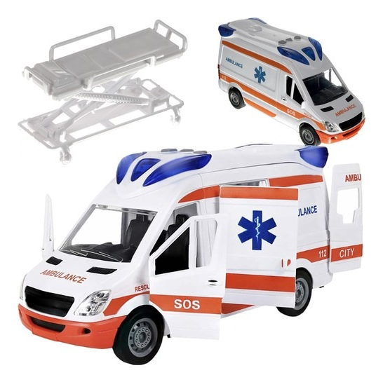 Hermosa Ambulancia para jugar a fricción. Con varios detalles como puertas, luces, sonido y una camilla con ajuste de altura.