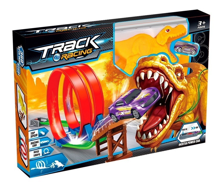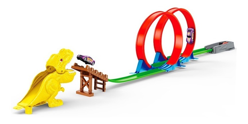 Es un juguete muy divertido que los niños adoran y el desafío es pasar si daños por un terrible dinosaurio. El autito comienza desde el lanzador y debe vencer las dos vueltas de 360 grados, luego de eso debe superar al Dinosaurio.